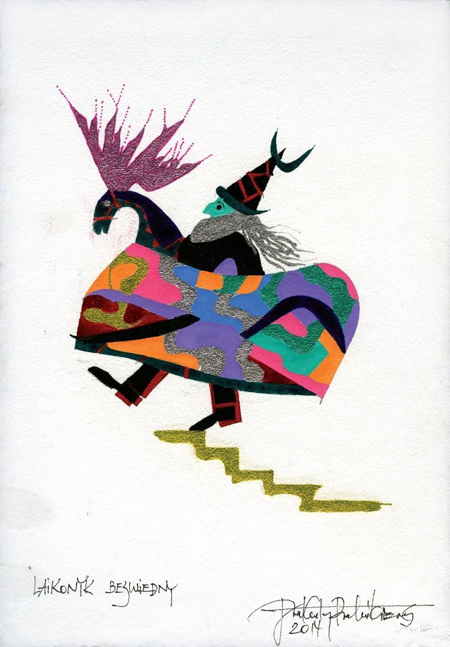 Grafika z cyklu „Lajkoniki”, wykonana unikalną techniką żel-art. Niezwykle detaliczna i dekoracyjna praca będzie piękną ozdobą każdego wnętrza. Praca dostępna jest w dwóch wielkościach: S 21×29 cm (1800 zł) oraz A 38×55 cm (3200 zł). Grafika jest wykonywana ręcznie przez autora po zamówieniu, w związku z czym czas oczekiwania jest każdorazowo ustalany z artystą.