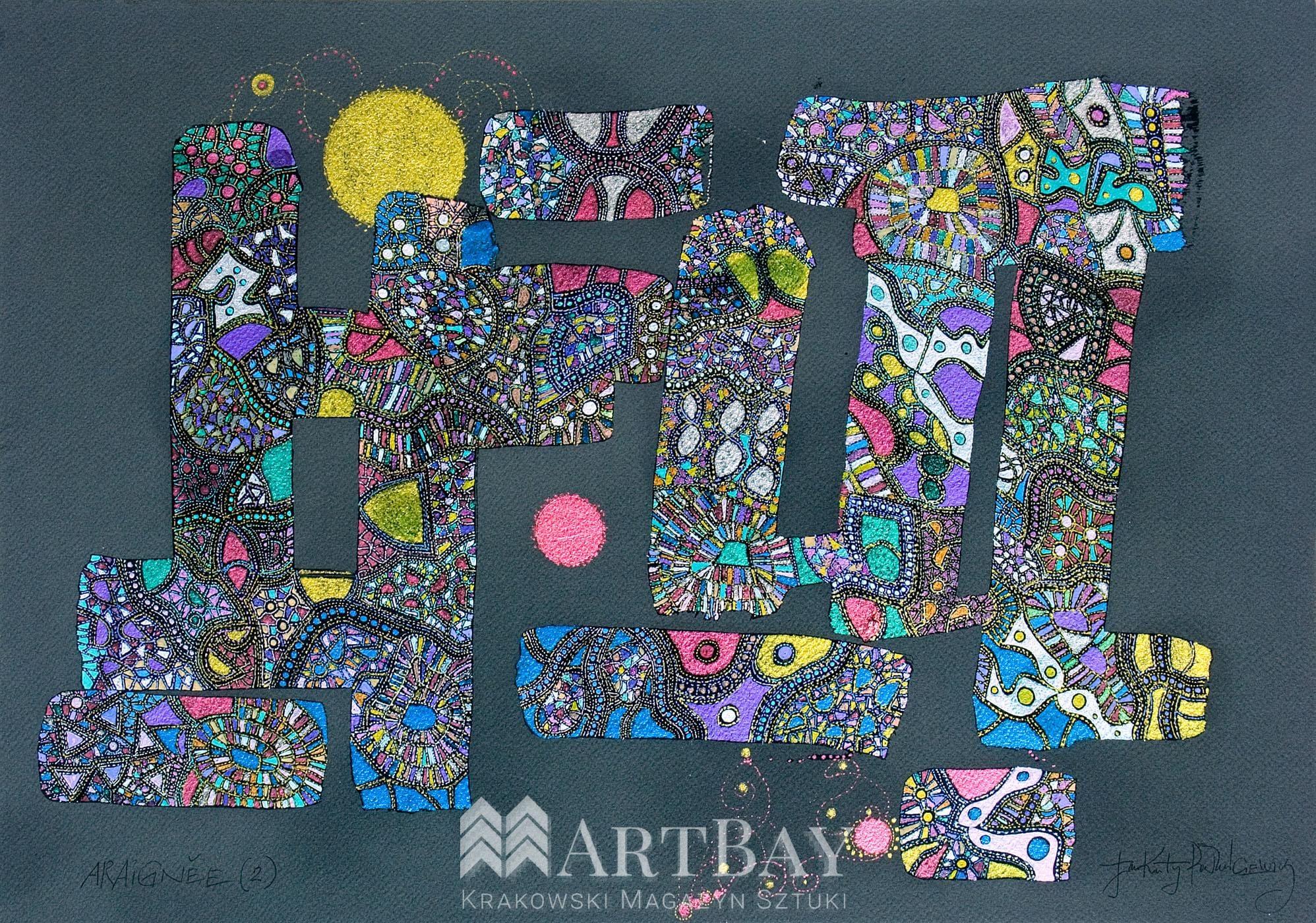 Grafika z cyklu „Sensy, Byty, Mary”, utrzymana w kolorach szarości, wykonana unikalną techniką żel-art. Niezwykle detaliczna i dekoracyjna praca będzie piękną ozdobą każdego wnętrza. Praca dostępna jest w trzech wielkościach: S 21×29 cm (1800 zł), A 38×55 cm (3200 zł) oraz M 45×67 cm (3800 zł). Grafika jest wykonywana ręcznie przez autora po zamówieniu, w związku z czym czas oczekiwania jest każdorazowo ustalany z artystą.