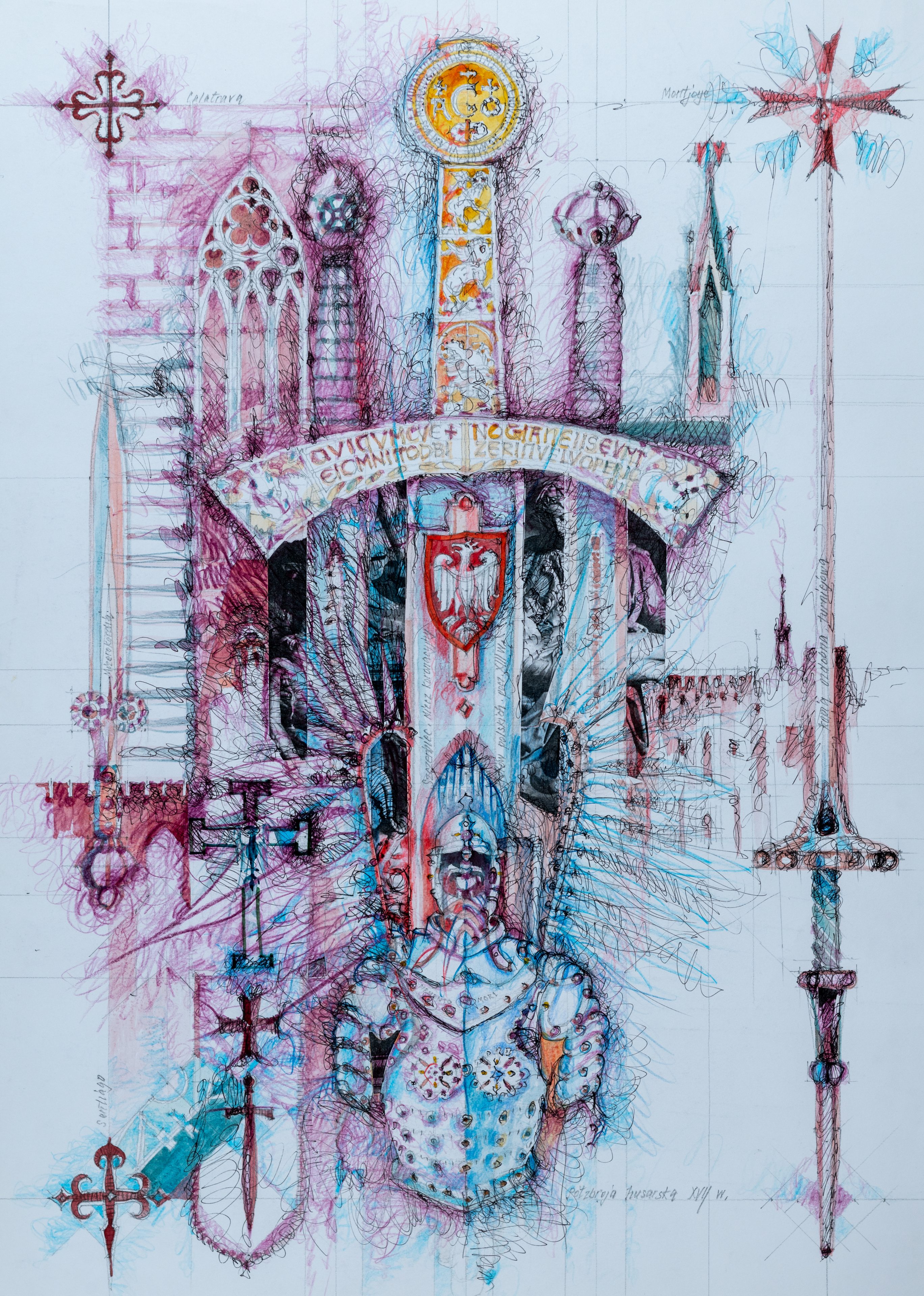 Sczerbiec – królewski miecz koronacyjny (z orłem i inskrypcjami), półpancerz husarski; kopia i mizerkordia; krzyże zakonów rycerzy maltańskich; mury i bramy gotyckie ~ Piotr Patoczka