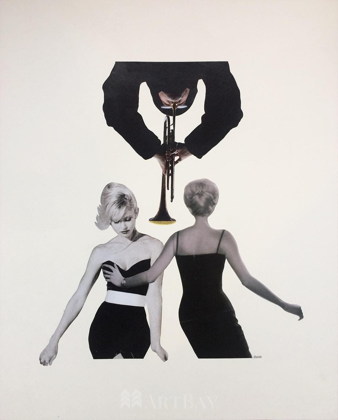 Praca wykonana techniką kolażu, przedstawiająca dwie kobiece postaci oraz trębacza.