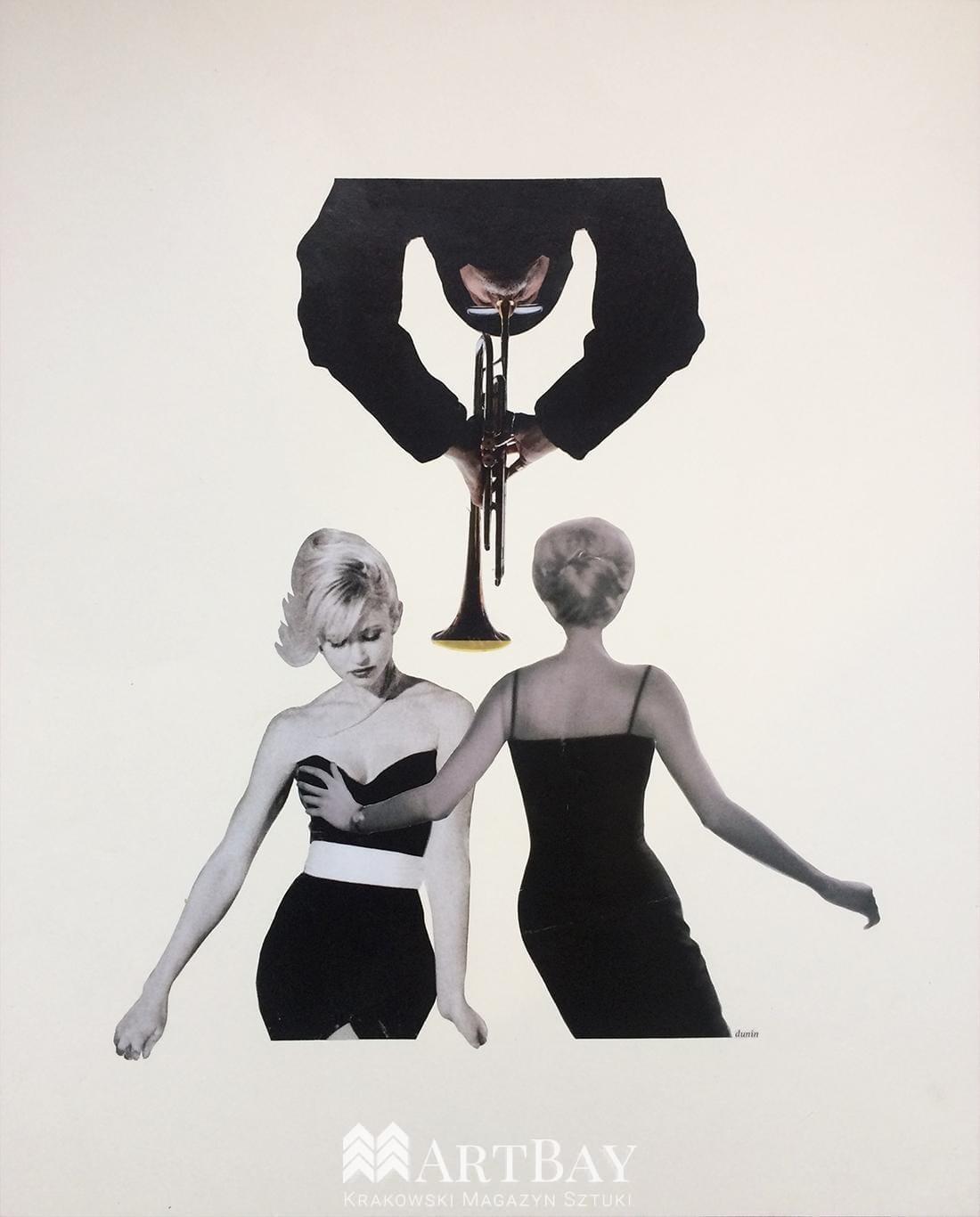 Praca wykonana techniką kolażu, przedstawiająca dwie kobiece postaci oraz trębacza.