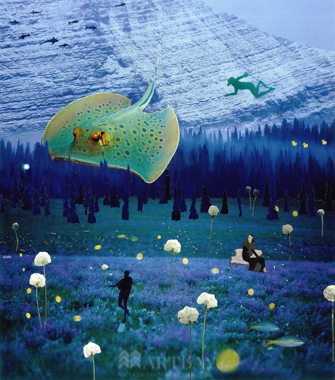 Surrealistyczny pejzaż wykonany w technice kolażu, utrzymany w błękitnej kolorystyce.