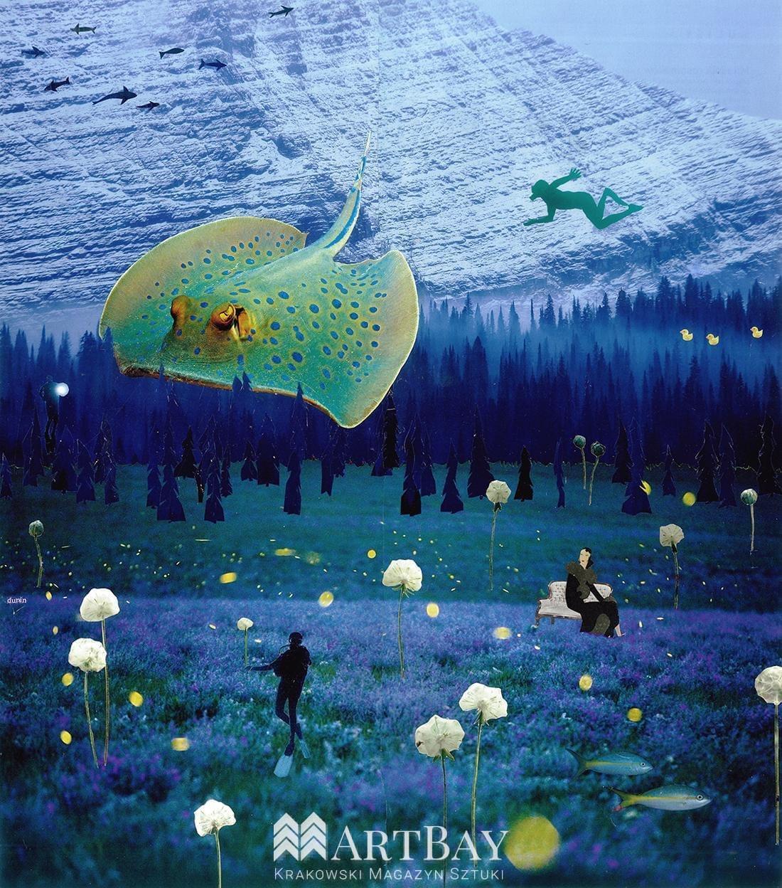 Surrealistyczny pejzaż wykonany w technice kolażu, utrzymany w błękitnej kolorystyce.
