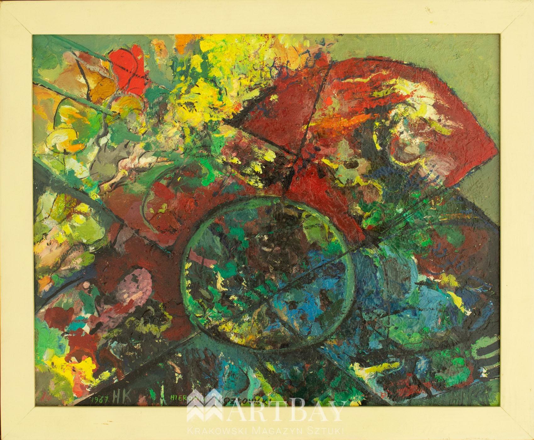 Obraz olejny przedstawiający abstrakcyjny pejzaż powstał w Polsce w 1967 roku. Łączy w sobie ekspresyjny gest grubo położonej farby z geometrycznymi kształtami i liniami. Obraz ma kolekcjonerski charakter, pasuje do każdego wnętrza – tradycyjnego, nowoczesnego, w szczególności do biura lub salonu albo sypialni. Oryginał oprawiony w prostą drewnianą ramę w kolorze kremowym.