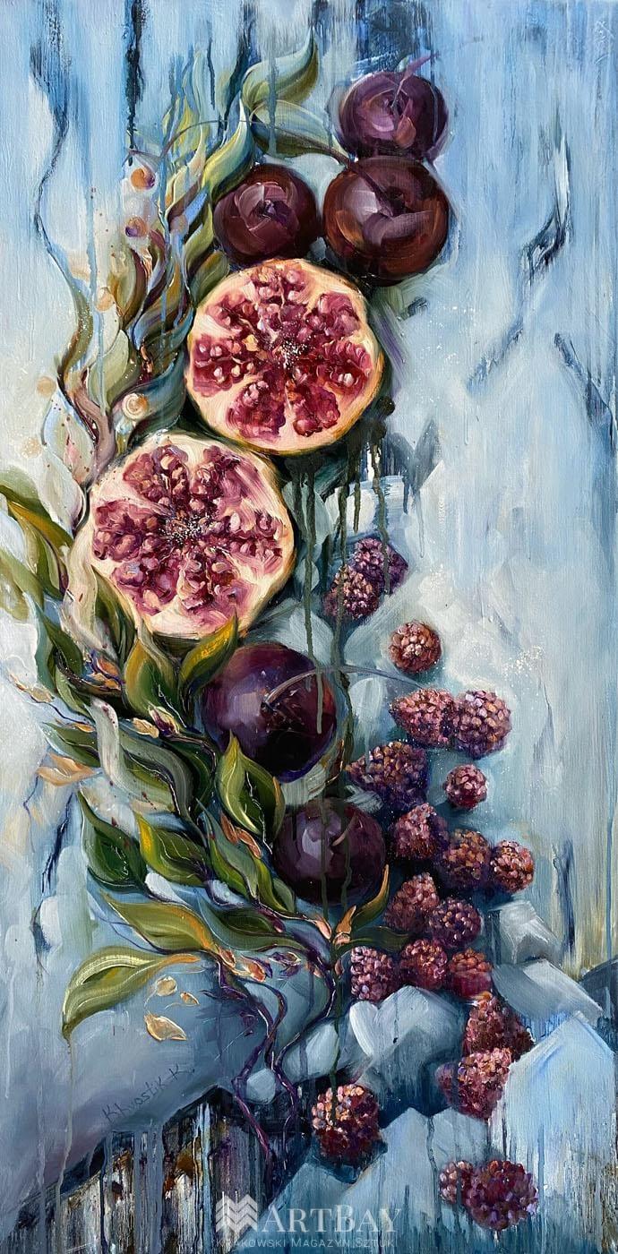 Wyjątkowa kompozycja martwej natury – soczystych granatów. Obraz namalowany na podobraziu płóciennym, farbami olejnymi. Stworzony w roku 2021. Obraz ma kolekcjonerski charakter, pasuje do każdego wnętrza – tradycyjnego, nowoczesnego, w szczególności do kuchni lub salonu albo sypialni, ale także do biura.