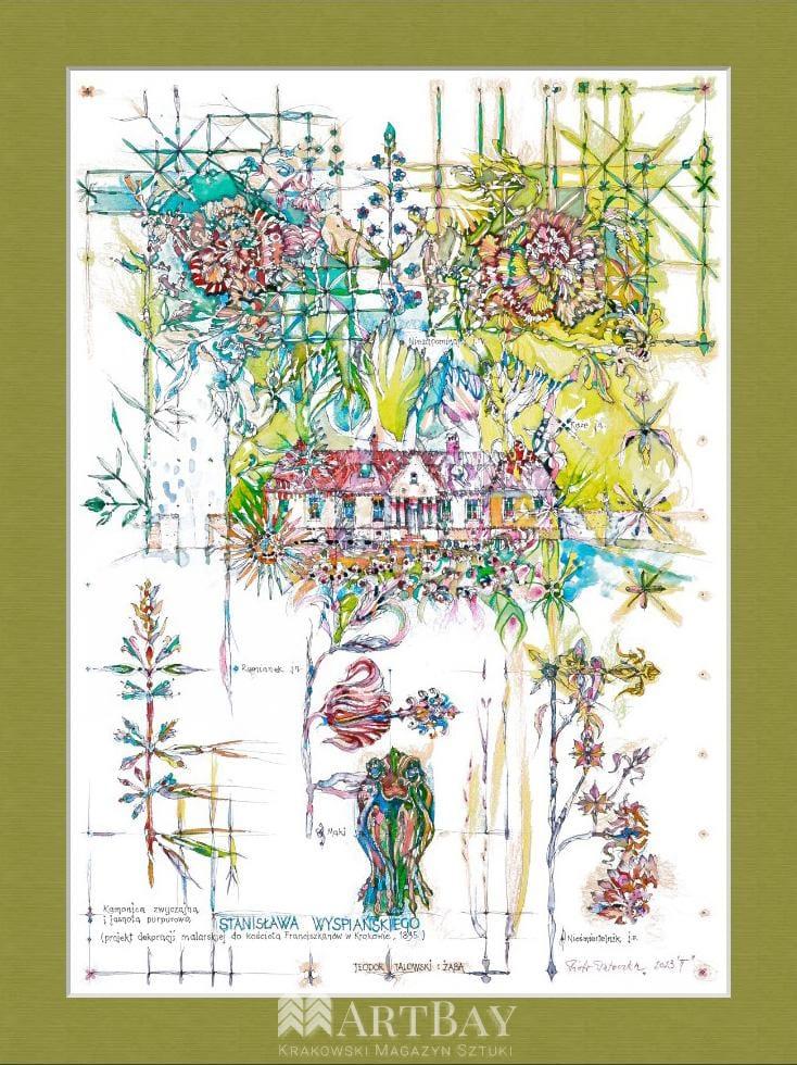 W środku sylweta dworu w otoczeniu parkowym. W górnej części „Róże Wyspiańskiego” na tle witrażu. W dolnej części sylweta żaby (rzeźba Teodora Talowskiego), wokół niej kwitnące kwiaty (wg studiów Stanisława Wyspiańskiego). Format oryginału 50×70 cm, pionowo, technika akwarela, kredka i tusz.