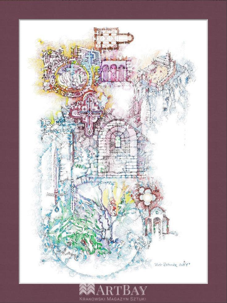 W lewym górnym rogu „moneta z barankiem” z klasztoru tynieckiego, obok triforium i krzyż romański. Wyżej pierwotny plan Kościoła św. Andrzeja. W prawym górnym narożniku romańska zabudowa Wzgórza Wawelskiego. Po środku okna z Rotundy Najświętszej Panny Marii, poniżej smok wychodzący ze Smoczej Jamy. Nad tym miecz koronacyjny i włócznia św. Maurycego. Format oryginału 50×70 cm, pionowo, technika akwarela, kredka i tusz.
