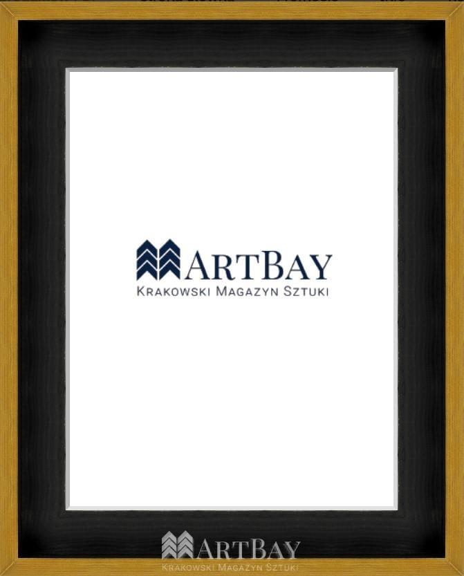 Rama drewniana sosnowa w kolorze czarnym ze złotym rantem. Profil ramy prosty typu „american box”. Obraz oprawiony w ramę tego typu nie ma zasłoniętych boków a pomiędzy ramą a obrazem tworzy się pusta przestrzeń – margines szerokości od około 5 mm do 20 mm (do wyboru). Wysokość ramy 40 mm, szerokość zależna od oprawy. Rama przeznaczona do oprawy obrazów płócien na krośnie, blejtramie . Drewno sosnowe malowane, zdobione na złoto akrylem woskowane.