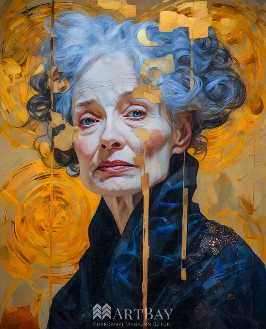 Seria prac, nawiązujących stylem do twórczości artystów przełomu XIX i XX wieku. Na obrazie starsza kobieta w złocie, która spogląda na nas głębokimi, błękitnymi oczami…
