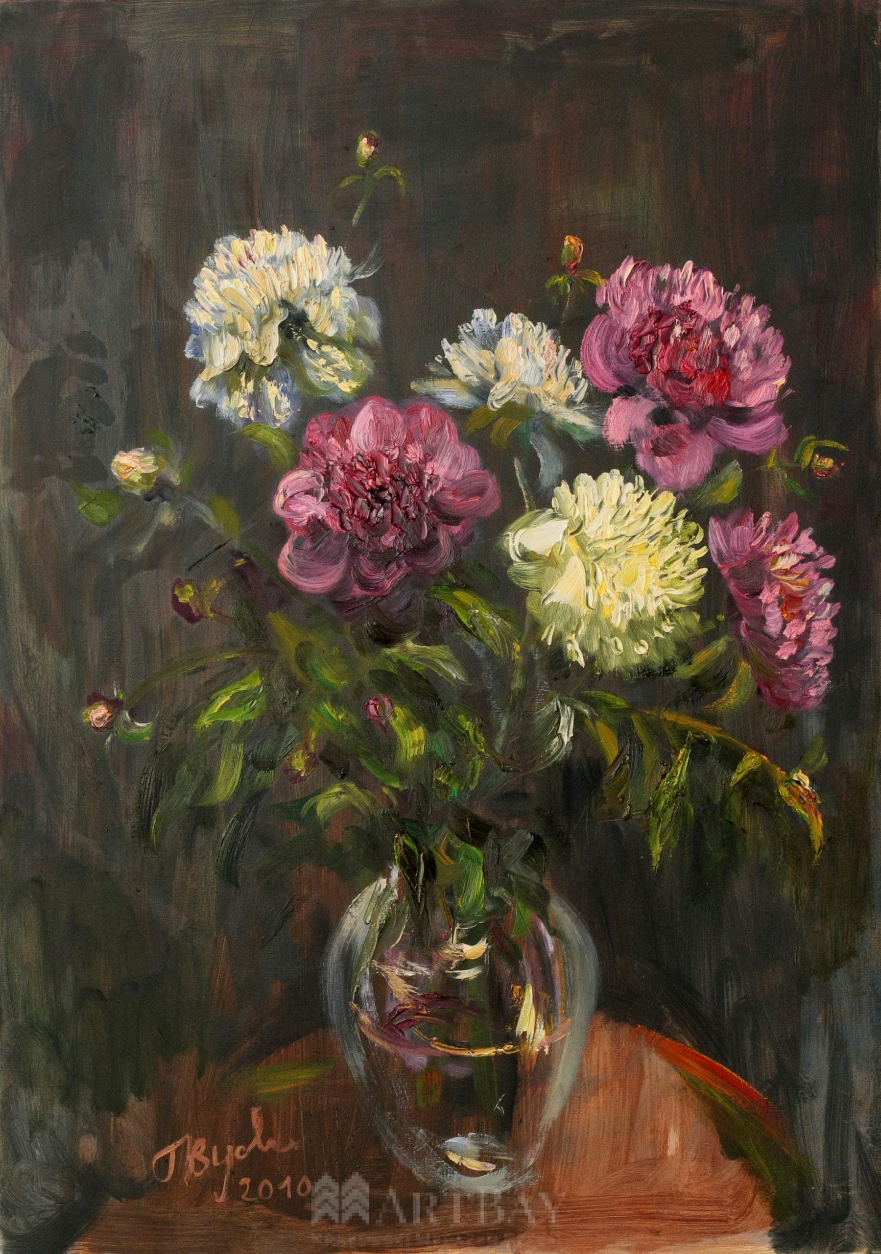 Kwiaty namalowane są niemal tylko szpachlą, aby uwydatnić fakturę i „napęczniałe” pąki kwiatów, a także grę światła. Kontrast między lśniącymi w słońcu kwiatami a ponurym tłem ma znaczenie wręcz symboliczne i metafizyczne. Wyjątkowa martwa natura przedstawiająca kwiaty – przepiękne piwonie to obraz namalowany na podobraziu płóciennym, farbami olejnymi. Stworzony w Poznaniu. Obraz ma kolekcjonerski charakter, pasuje do każdego wnętrza – tradycyjnego, nowoczesnego, w szczególności do biura lub salonu albo sypialni.