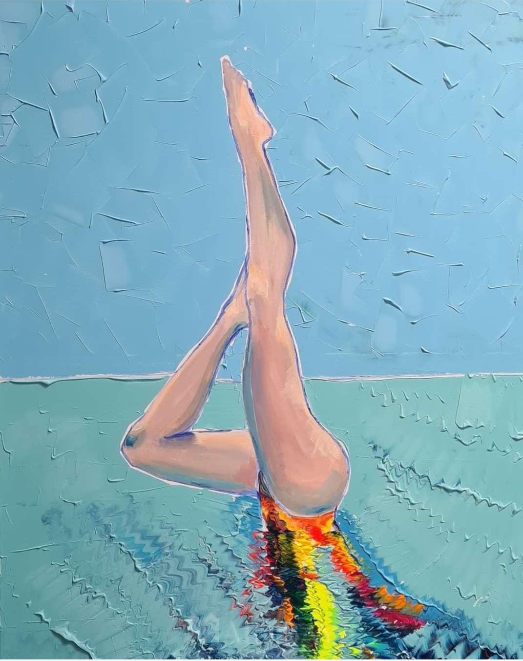 Wyjątkowy obraz przedstawiający pływaczkę. Obraz namalowany na podobraziu płóciennym, farbami akrylowymi. Obraz ma kolekcjonerski charakter, pasuje do każdego wnętrza – tradycyjnego, nowoczesnego, w szczególności do biura lub salonu albo sypialni.