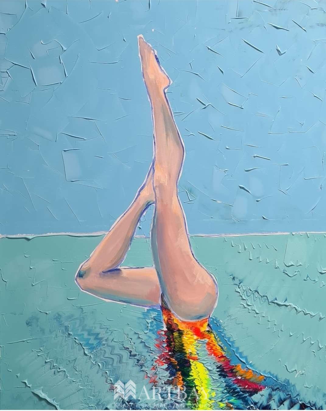 Wyjątkowy obraz przedstawiający pływaczkę. Obraz namalowany na podobraziu płóciennym, farbami akrylowymi. Obraz ma kolekcjonerski charakter, pasuje do każdego wnętrza – tradycyjnego, nowoczesnego, w szczególności do biura lub salonu albo sypialni.