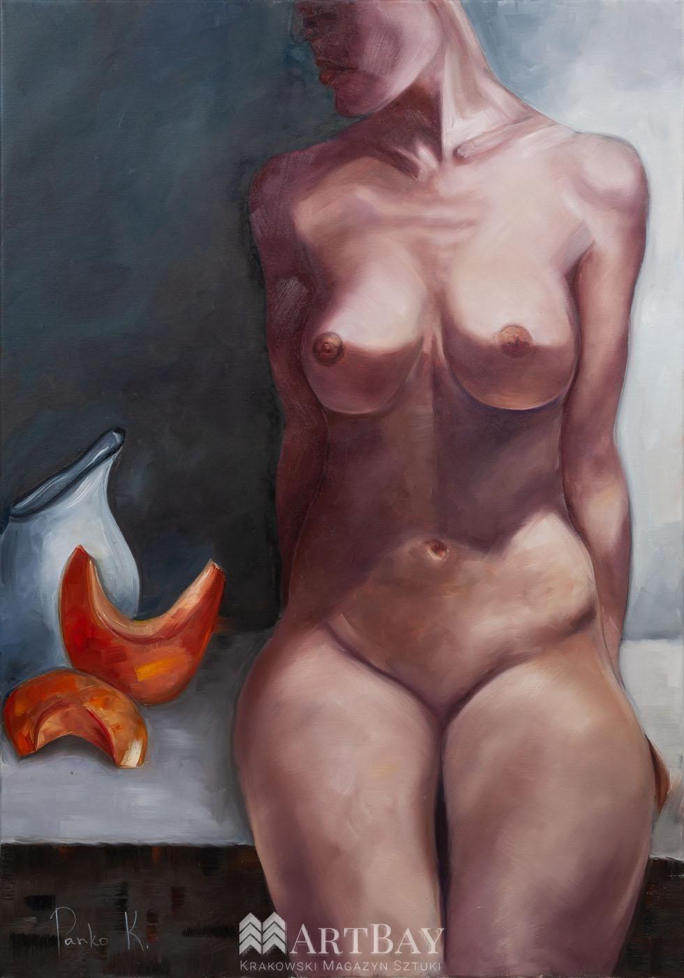 Wyjątkowy akt kobiecy. Obraz namalowany na podobraziu płóciennym, farbami olejnymi, wykończony szlagmetalem (idealną imitacją złota w płatkach). Stworzony w Krakowie w 2022r. Obraz ma kolekcjonerski charakter, pasuje do każdego wnętrza – tradycyjnego, nowoczesnego, w szczególności do biura lub salonu albo sypialni.