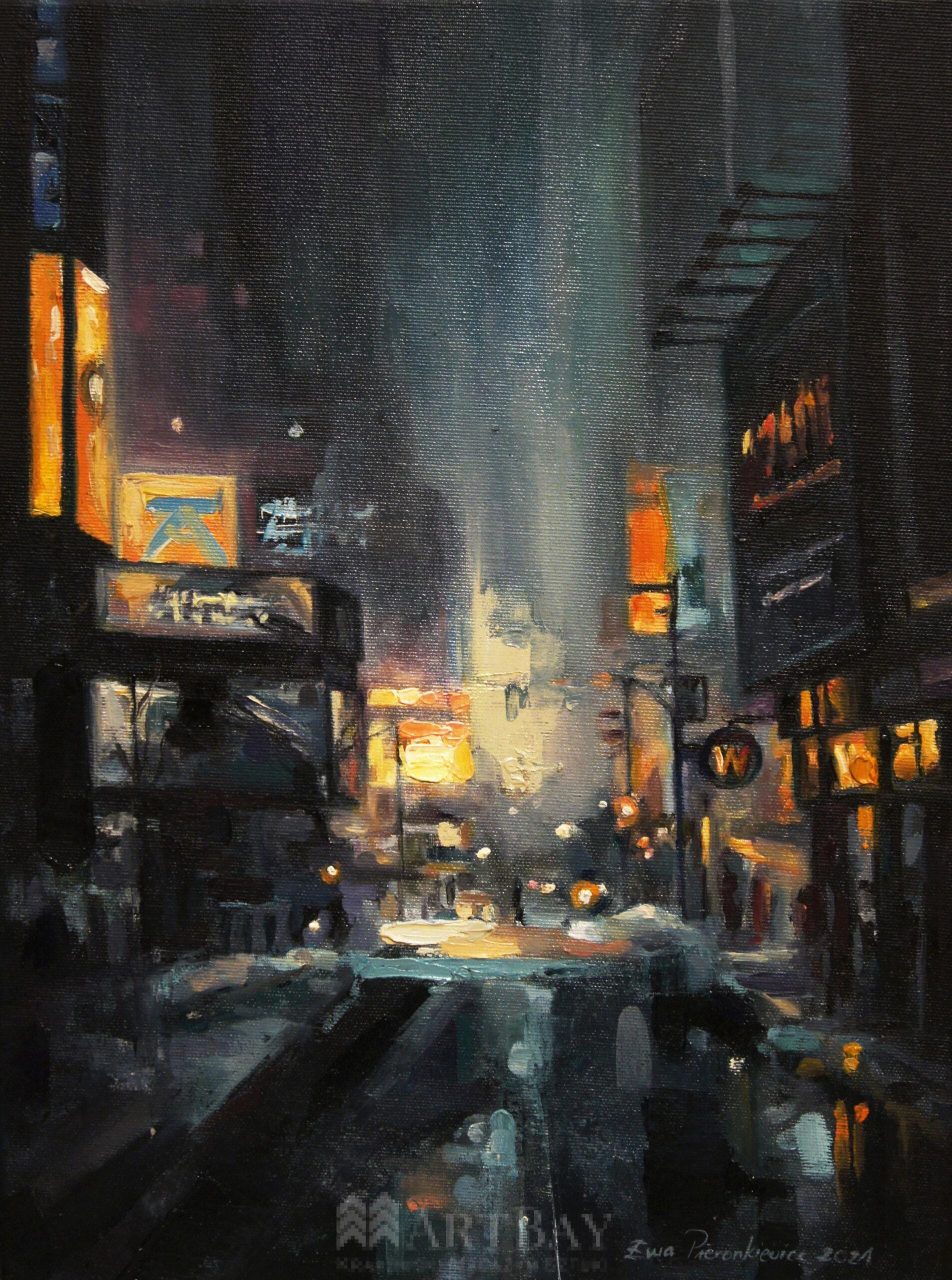 Obraz przedstawia Times Square nocą w światłach latarni oraz neonów. Namalowany został na podobraziu płóciennym farbami olejnymi. Stworzony w Krakowie. Obraz urozmaici przestrzeń salonu, sypialni, gabinetu lub biura. Uatrakcyjni wnętrze i doda nowojorskiego klimatu.