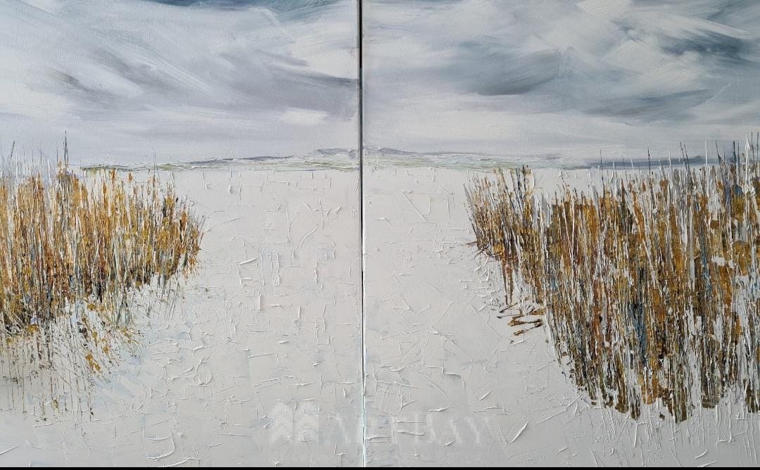 Wyjątkowy obraz przedstawiający zamarznięte jezioro i trzciny. Obraz namalowany na podobraziu płóciennym, farbami akrylowymi. Obraz ma kolekcjonerski charakter, pasuje do każdego wnętrza – tradycyjnego, nowoczesnego, w szczególności do biura lub salonu albo sypialni.