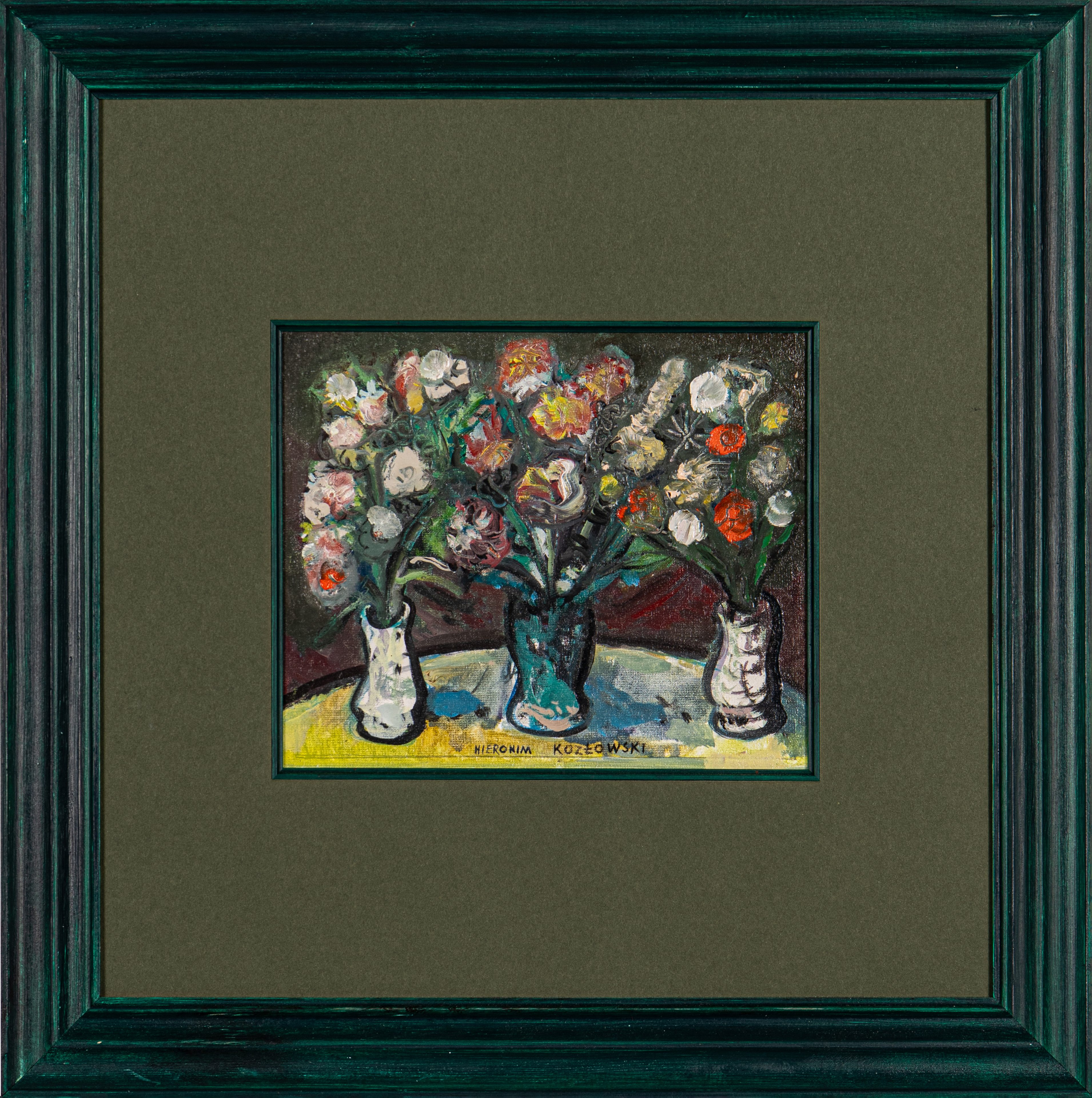 Pełna energii, ekspresyjna kompozycja przedstawiająca trzy wazy wypełnione barwnymi kwiatami. Artysta uchwycił ulotność natury z siłą gestu i bogactwem koloru, które przenoszą widza w świat malarskiej emocji i wrażliwości. To dzieło, powstałe w połowie lat 60., emanuje szczerością i autentyzmem epoki, w której sztuka odważnie poszukiwała nowych środków wyrazu.