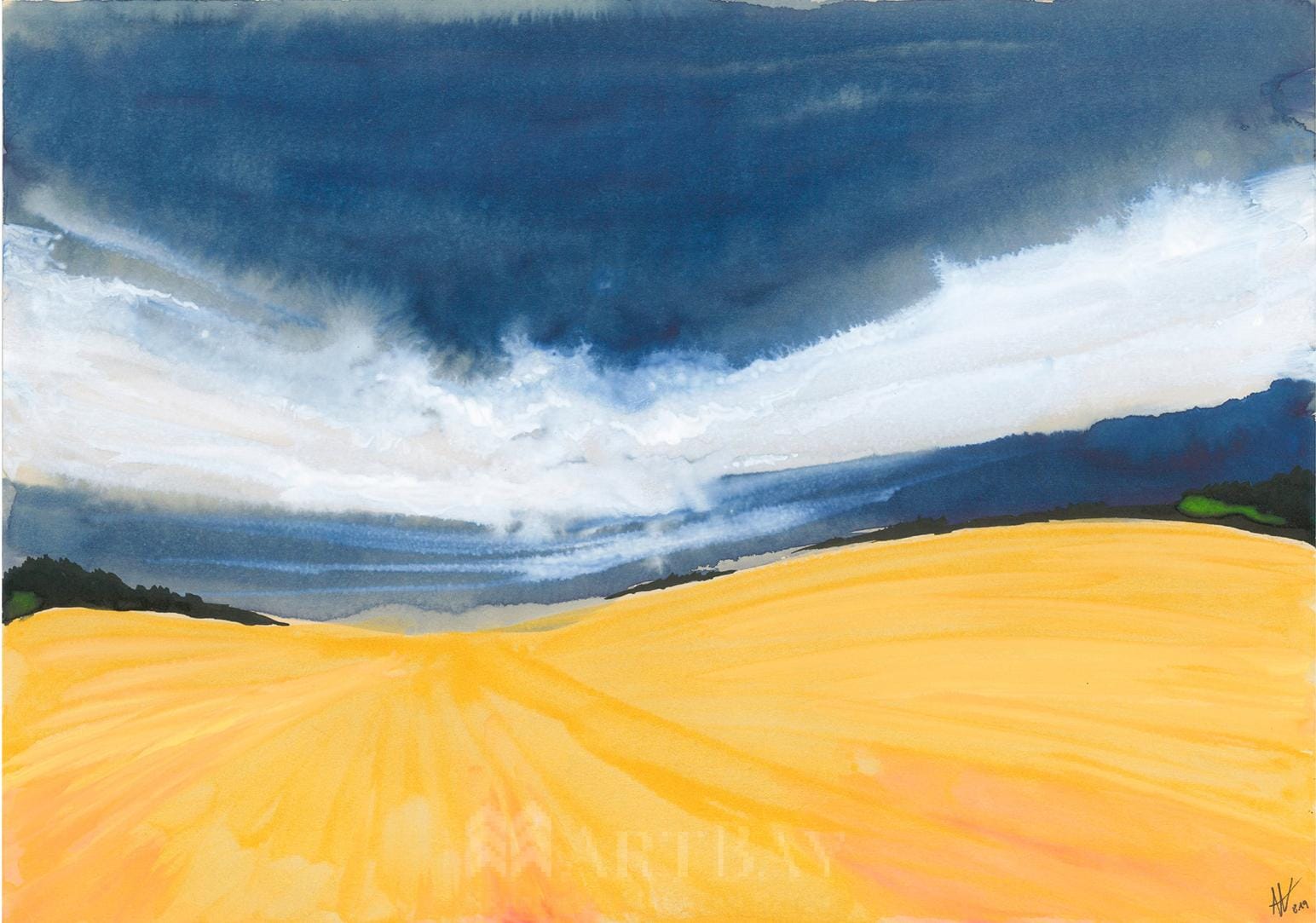 Pejzaż przedstawiający rozległe pola. Oryginał wykonany atramentem oraz tuszami na beżowym papierze. Użycie złotego tuszu zmieszanego ze słomianym oraz czerwonym kolorem pozwoliło na osiągnięcie efektu migotania barw i oddania przestrzeni falujących pól.